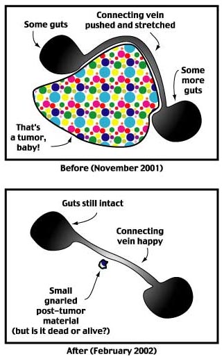 Is that a tumor in your spleen or are you just happy to see me? This past Tuesday, a week before I get my Pet Scan (which should really determine if the chemo did its job), I met with my oncologist, Dr. Woliver, to get a checkup and take a look at my previous CT scans and MRI. Boy, what a difference a little chemo can make. Ok, a lot of chemo. Ok ok, twelve weeks' worth of chemo. Dr. Woliver showed me several comparative and side-by-side) scans of my body. The left side contained scans taken in early November. The right side contained scans taken a few weeks ago. Since I don't have any pictures to show you, I decided to make my own. Below is my artistic rendition of one of the scans I was shown.
