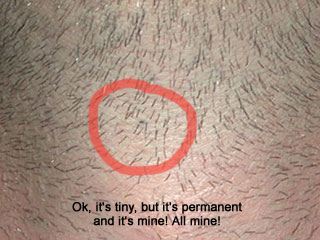 So what's the point of this and the previous story? Having a cancerous tumor take away my ability to walk (and make any sort of balance a whole new adventure) is a big deal. It's made me really come to terms with my own self-comfort. There's a lot I can't do (yet!) and I've had to allow myself to accept these limitations. What's been wonderful about this situation is that I've learned to appreciate myself in spite of things that could make me feel awkward or embarrassed. I'm much more present in my own life, much more aware of myself and the things I *can* do right now. Having to break through the self-esteem barrier has allowed me to smile where a frown might seem more appropriate. Pretty cool, huh? Now on to radiation. I met with my radiologist (Dr. Weisenberger) last week in the Cancer Center to discuss my radiation schedule. I was very, very happy to hear him tell me that the PET scan was indeed clean, and they don't see any cancerous activity in my body. Woo hoo! This lack of activity caused a bit of a conundrum (I like the word "conundrum" -- and "clandestine") in that he had to consult "the experts" to determine if I even needed radiation. We should all feel very proud that I was so healthy that the doctors had to regroup and decide how to proceed with Miracle Matt. Dr. Weisenberger called doctors at Stanford and Texas, among others. After some discussion, they decided that I should indeed get radiation. Since I had such advanced Hodgkins, cancer which spread throughout my torso, they will do 4 weeks worth on my chest, wait 2 weeks, and then do 4 weeks on my abdomen. Doing both areas at once would probably lower my blood counts too much, so they split it up. This was disappointing, to say the least. I had previously been told it would probably be 2-3 weeks. After the consultation, I put on a hospital gown and went through a test run of the radiation process They do this to align the machine to my body shape. In order to ensure the machine can accurately send radiation to the same place each time, they gave me 4-5 "tattoos" on my upper body (I'll probably get more before the abdominal sessions). The tattoos are little black dots, smaller than a freckle. Check it out: