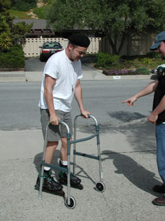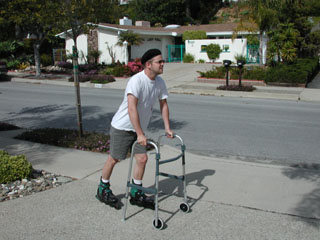 I didn't want to purchase pads just for a few weeks, and Stuart and Lexie didn't want to be my support (they'd rather watch and laugh). So I chose to use my walker. I took my walker and roller blades from my car trunk (did I mention that the two things that I keep in my trunk are my walker and my roller blades? Prophetic, huh?) and prepared to roll (and fall).