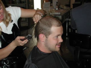 Baby needs a new pair of shoes... and a haircut. This entry is going to be short on words, but long on pictures. I have a wedding to attend in Yosemite this weekend (yay Darren & Jill!) and want to get this entry in before I leave. Last Saturday night (April 13, 2002), I had a happy-yippy-cool party. And while I didn't tell anyone that the party was to launch and celebrate my new post-cancer life, people knew anyway. I was really amazed how many people understood what was going on in my heart, even if it wasn't in the invitation. I guess people are really starting to know me (remember, I did talk about my bowel issues during my first few journal entries). The day before the party, however, I realized that I needed a haircut. Can you believe it?! Enough hair had grown back that I had to actually cut it! Ok, ok, not much was cut, and my hair is still very short, but I should be back to "normal" (I've found that there is no normal) in a few more months. My friend, and hair stylist, Tobey did the chopping.
